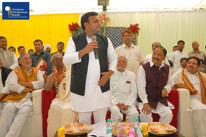 Sri Akhilesh Yadav laid down the foundation stone for the temple in a Shilanyas ceremony held on March 16, 2014, on the occasion of Holi. This day was especially auspicious as it coincided with Gaura Purnima, the appearance day of Lord Chaitanya Mahaprabhu who propagated congregational chanting of the holy names of Lord Krishna. Sri Madhu Pandit Dasa, Chairman and Sri Chanchalapathi Dasa, President of the Vrindavan Chandrodaya Mandir were present during the ceremony.