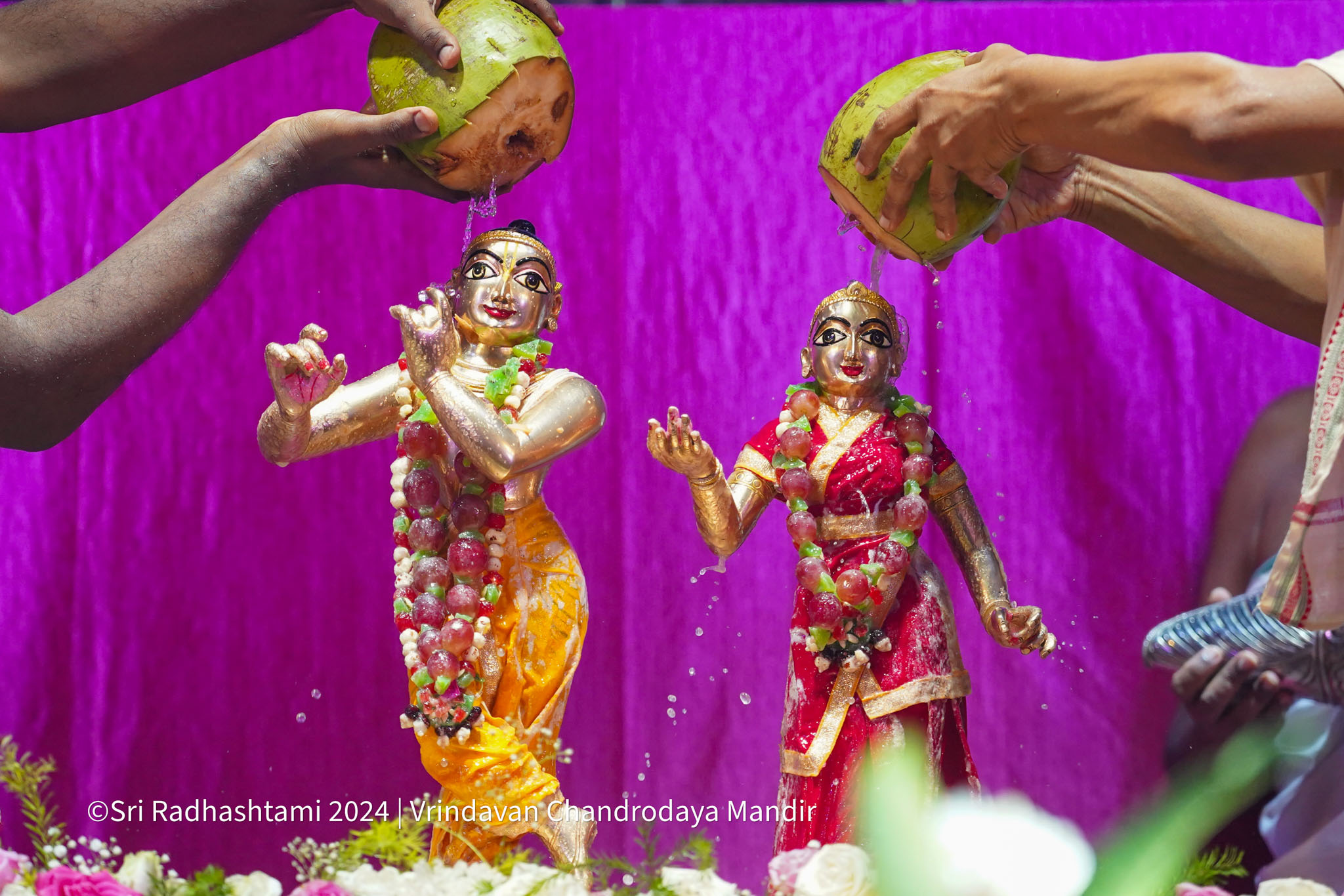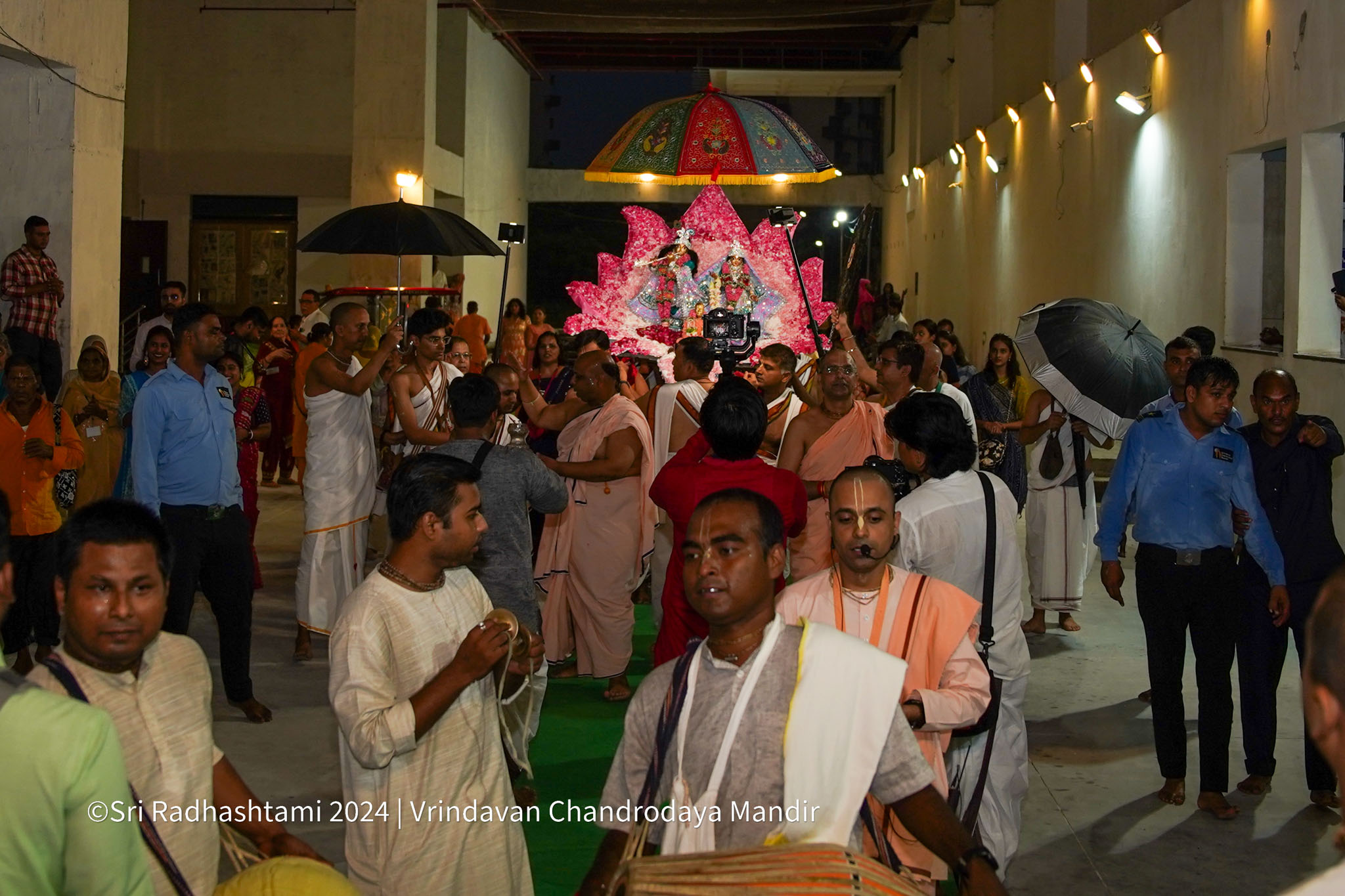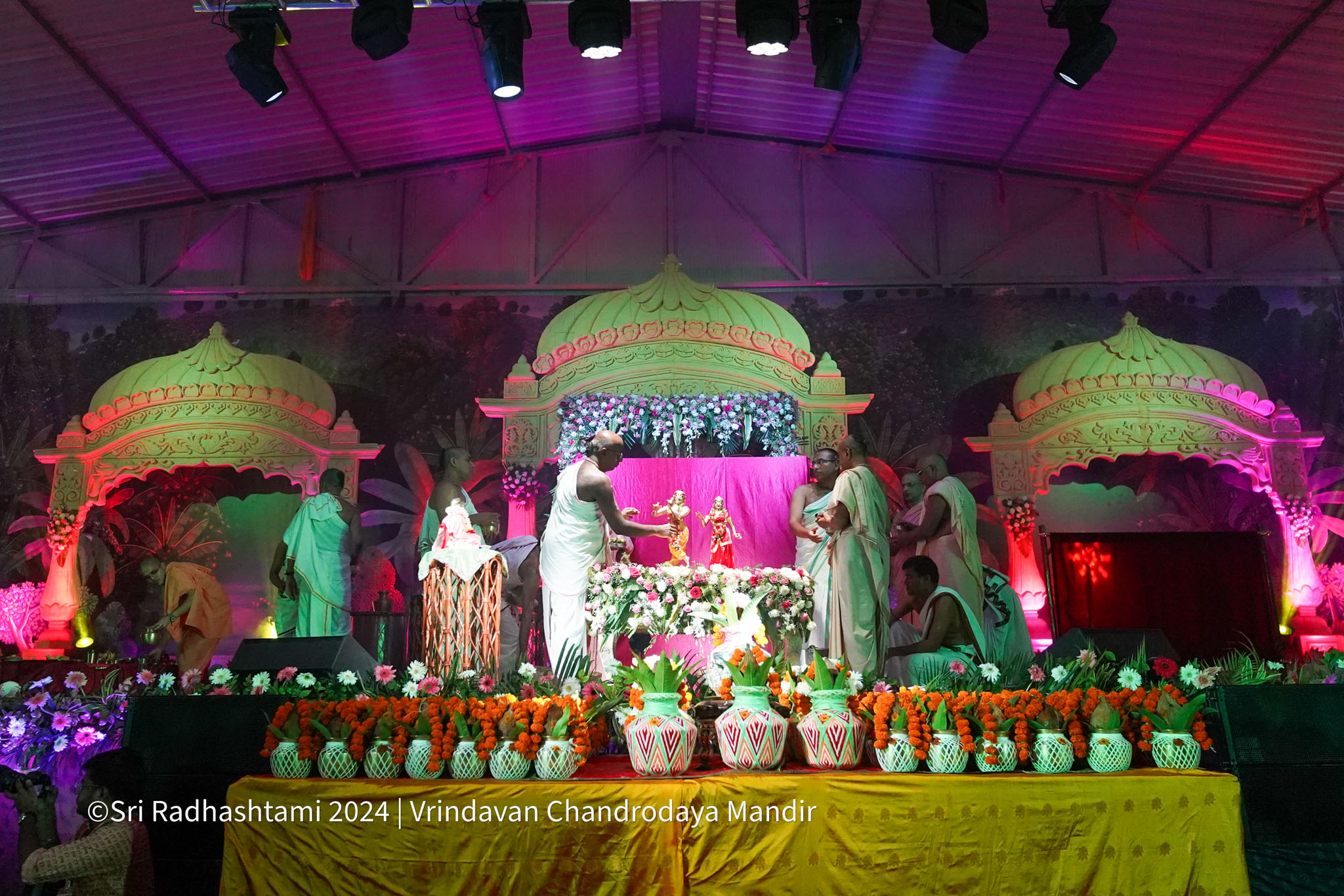 Sri Radhastami, the auspicious appearance day of Srimati Radharani, was celebrated with great joy at Vrindavan Chandrodaya Mandir. The Utsava Deities of Sri Radha Vrindavanchandra received an elaborate abhishek and arati accompanied by Vedic chants and kirtans.